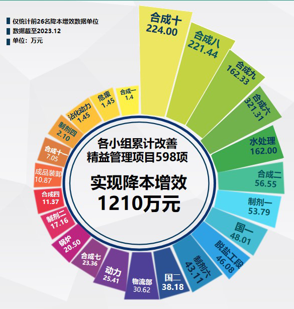全年共計87個車間(部門)參與精益改善,濱州與沾化基地共評價改善項目598項,降本增效約1200余萬元。甘肅基地提交改善項目158項,降本增效551萬元。公司為鼓勵各系統(tǒng)參與改善,促使產品增值并快速實現(xiàn)產品價值、組織增效,共發(fā)放激勵基金58330元。各分管副總分別就2024年卓越推進工作做了詳細要求,要求各改善團隊展開改善項目盤點工作,借鑒優(yōu)秀,對標持續(xù)改善,筑牢基礎管理工作。持續(xù)提質提效,降工降費,節(jié)能減排;持續(xù)三化融合,使人機配合更高效,精益數(shù)字高賦能。細化績效指標分解工作,將改善項目與部門績效、公司經營目標有效銜接。結合全年各改善團隊參與情況及改善績效,以及各系統(tǒng)分管領導評定,公司評選出四個年度優(yōu)秀精益改善團隊:制劑一車間、國一車間、合成七車間、危廢處理車間。