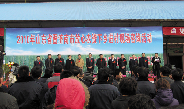2010年3月23日上午,2010年“山東省暨濟南市放心農資下鄉咨詢活動”在濟陽曲提鎮菜市場舉行。本次活動由山東省農業廳、濟南市政府和濟陽市政府聯合舉辦。會場選在鎮政府菜市場當中,人流如織,賣菜的農民順便參與到活動之中。濱農是山東農藥企業唯一的代表,公司帶去了適合當地使用的除草劑、殺蟲殺菌劑產品和宣傳材料。活動中廣大農民對我們的產品十分感興趣,我們詳細解答了農民朋友在使用中遇到的諸多實際問題。本次活動是去年我們所參加的省政府兩次活動的繼續,對提升濱農品牌的知名度十分有意義。