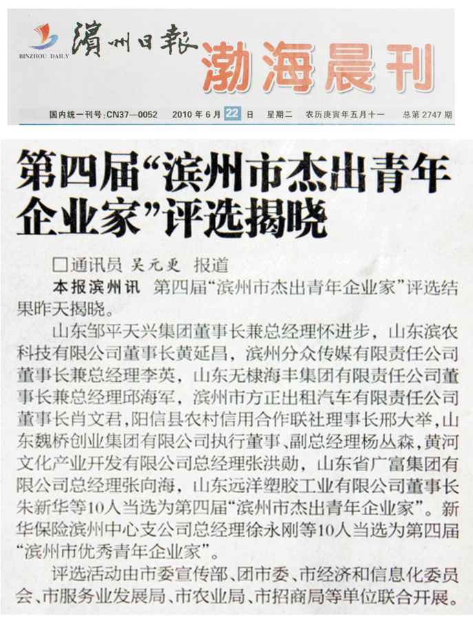第四屆“濱州市杰出青年企業(yè)家”評(píng)選結(jié)果已于6月22日揭曉,我公司董事長(zhǎng)黃延昌等10位優(yōu)秀企業(yè)家當(dāng)選為第四屆“濱州市杰出青年企業(yè)家”。評(píng)選活動(dòng)由市委宣傳部、團(tuán)市委、市經(jīng)濟(jì)和信息化委員會(huì)、市服務(wù)業(yè)發(fā)展局、市農(nóng)業(yè)局、市招商局等單位聯(lián)合開(kāi)展。