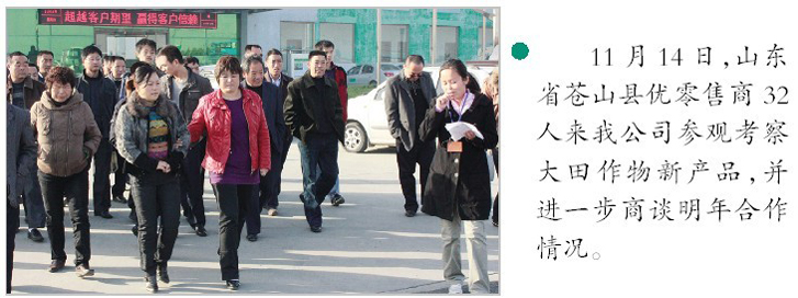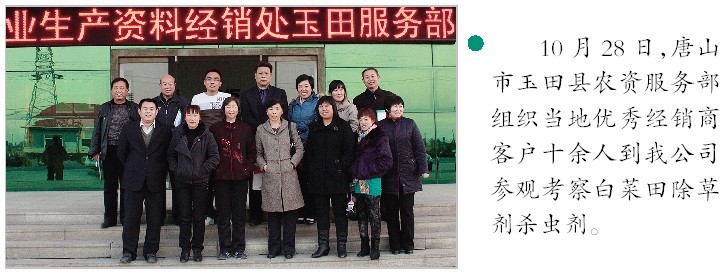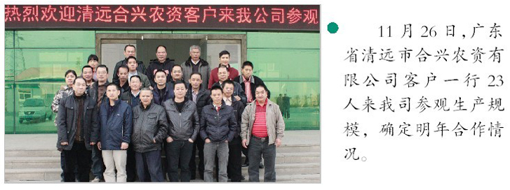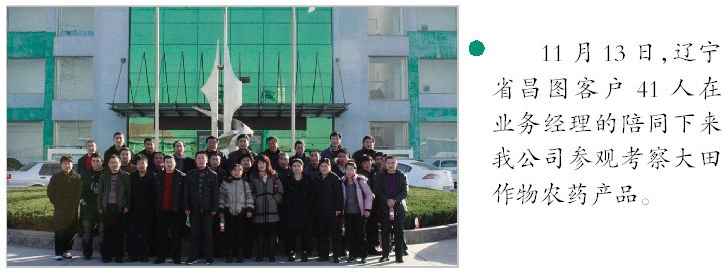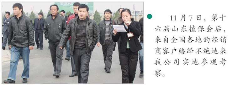 時間:2012-08-10 14:56隨著濱農品牌美譽度的不斷提升,各地客戶對濱農的認同度不斷加深。初冬時節(jié),農化市場進入銷售淡季,全國各地經銷商客戶紛紛慕名來我司參觀考察,意在全方位考察我公司生產實力、產品特色、新品上市等情況。公司解說員張娜、常海燕、舒麗麗與公司隨行業(yè)務人員分別向一批批客戶介紹著濱農,并陪同客戶朋友們實地參觀制劑生產線、成品倉庫、研究所等,及時向客戶解疑答惑。來訪客戶紛紛表示,通過參觀他們更真實的了解了濱農的生產規(guī)模、產品結構及綜合實力,與濱農的合作前景更加廣闊,信心更加堅定。